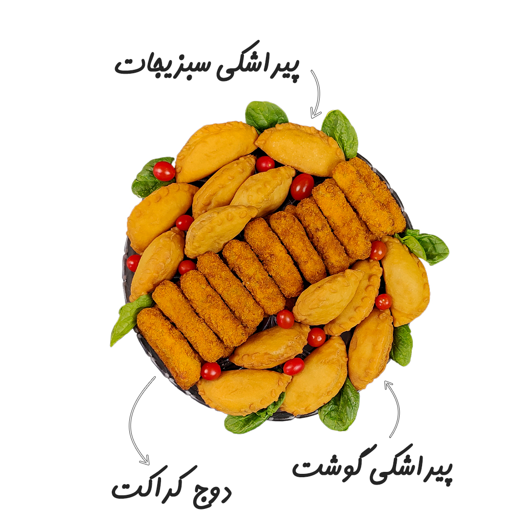 دوج کراکت :20 عدد پیراشکی گوشت:9 عدد پیراشکی سبزیجات: 9 عدد